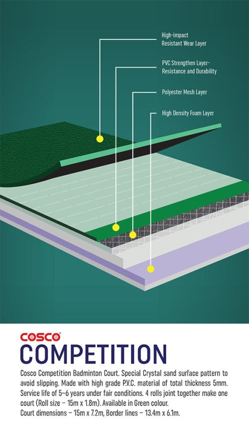 A full fledged Competition Badminton Court. It has 4 Rolls Per Court made from anti skid PVC Material which makes movement extremely swift for the player. The rolls have a strong 5 mm thickness which help absorbing shocks to the joints. It has an extremely long surface life of 7 years and is the court of choice for many major events in India.