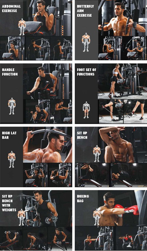 The CHG03 is the definition of utility. It is constructed with heavy duty material and strong padding for utmost safety for your joints and body. It comes with a 210lbs weight stack. The muscle groups possible to target include chest, biceps, triceps, shoulder and back. It has a special punching bag for box and abs station to help one get toned ab muscles. It can take user weight up to 150kgs.