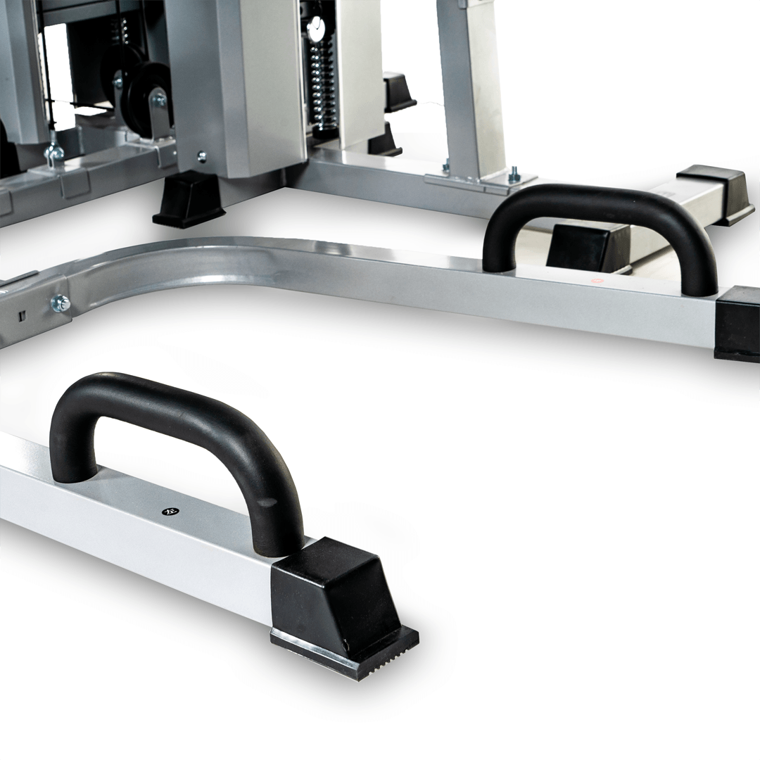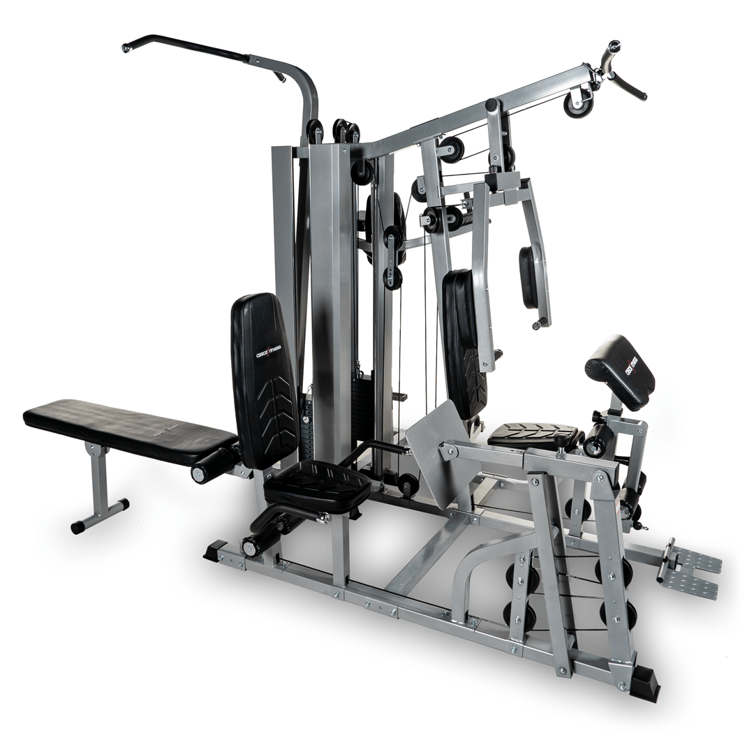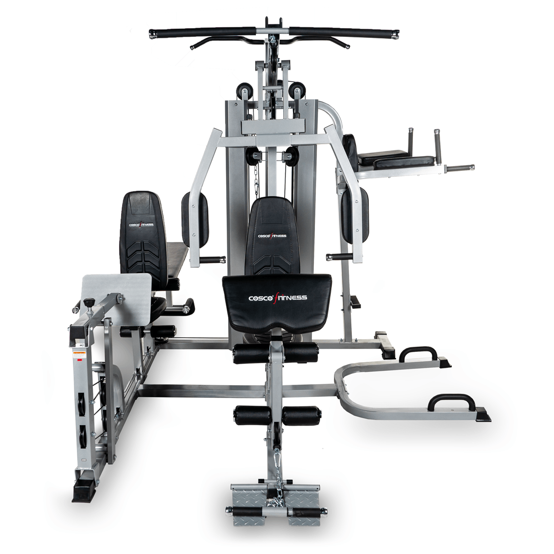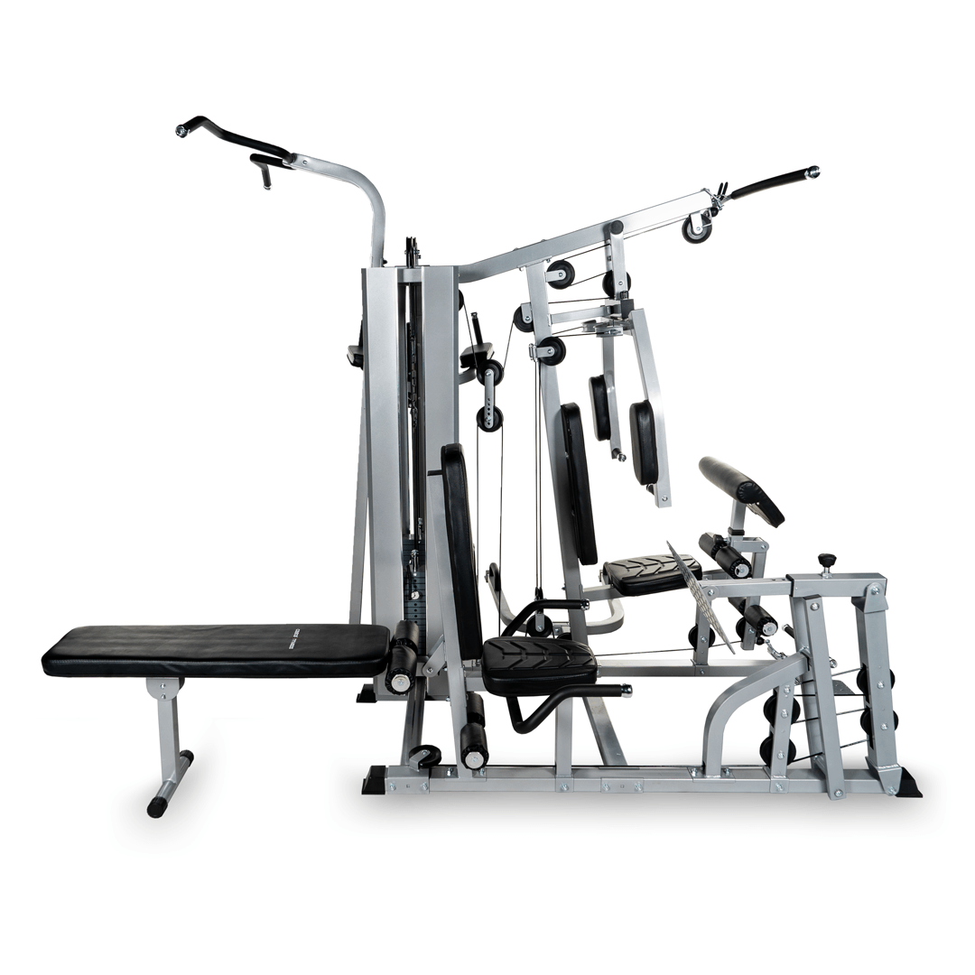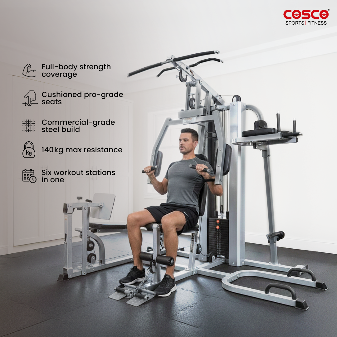 Six station gym is made out of top notch material and high quality padding to provide joint and body support. The pulleys are super smooth ensuring a quality workout. Six Station meet six person workout: station 1: tricep extension, leg extension, high pull AB crunch, tricep push-down, lat pull down, biceps curl, pectoral fly, seated press bar row, preacher curl, leg kick back, seated shoulder press, upright row, standing leg curl| station 2: leg press | station 3: push-up | station 4: knee raise, dip arm | station 5: chin up | station 6: sit up, dumbbell exercise. It can take user weight up to 150kgs.